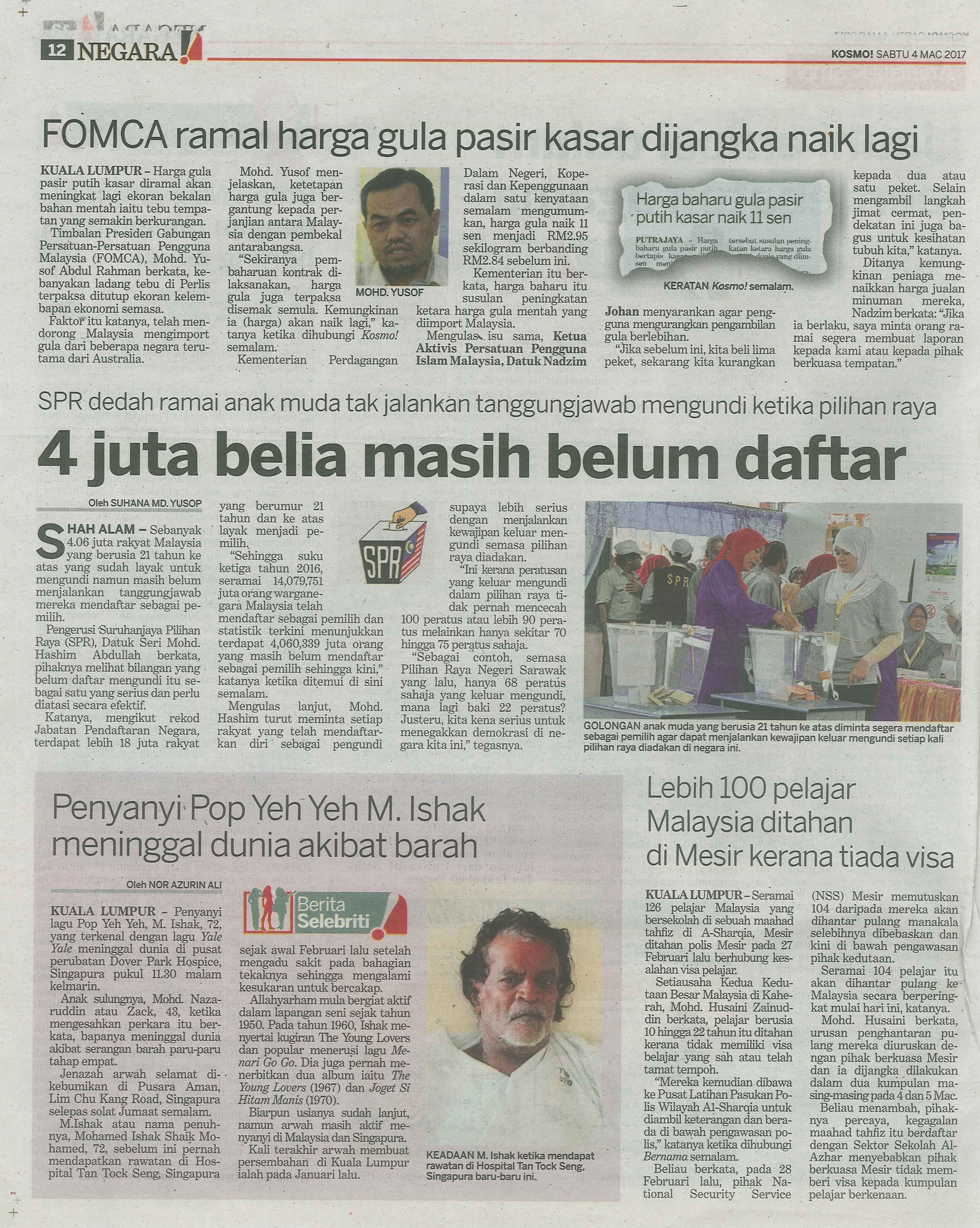 Ketua Aktivis Persatuan Pengguna Islam Malaysia, Datuk Nadzim Johan menyarankan agar pengguna mengurangkan pengambilan gula berlebihan.