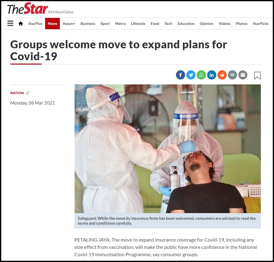 PETALING JAYA: The move to expand insurance coverage for Covid-19, including any side effect from vaccination, will make the public have more confidence in the National Covid-19 Immunisation Programme, say consumer groups.