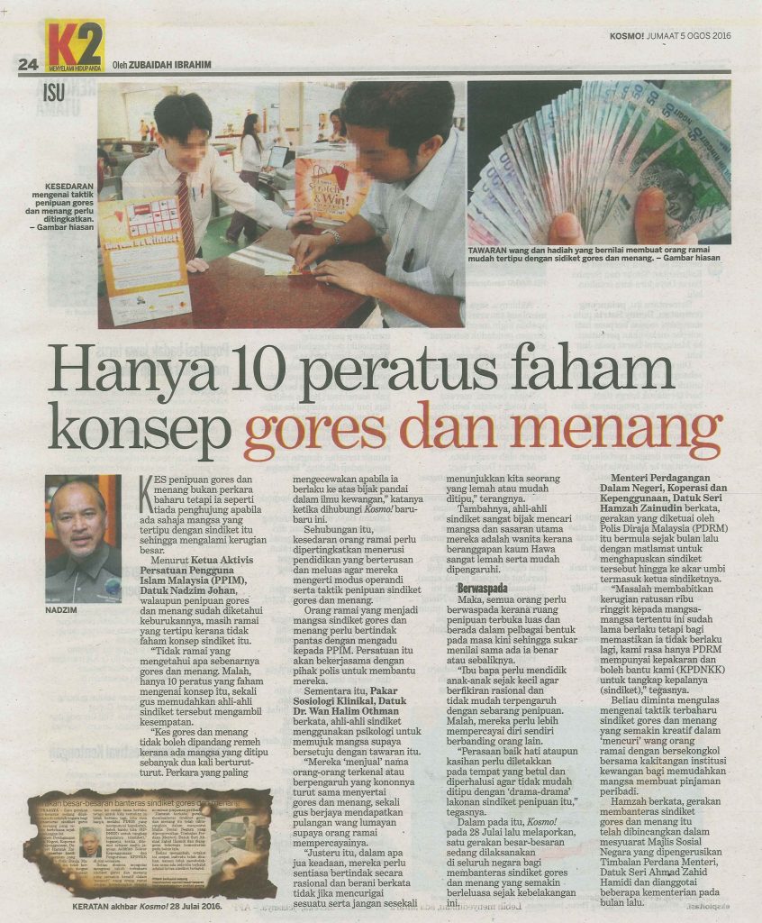 HANYA 10 PERATUS FAHAM KONSEP GORES DAN MENANG – KOSMO – 5/8/16