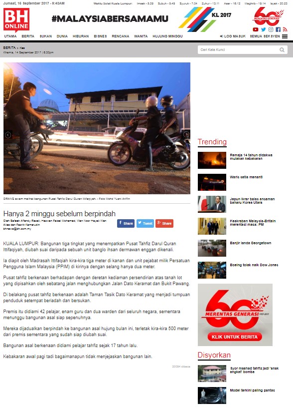 Bangunan asal berkenaan didiami pelajar tahfiz sejak 17 tahun lalu.
