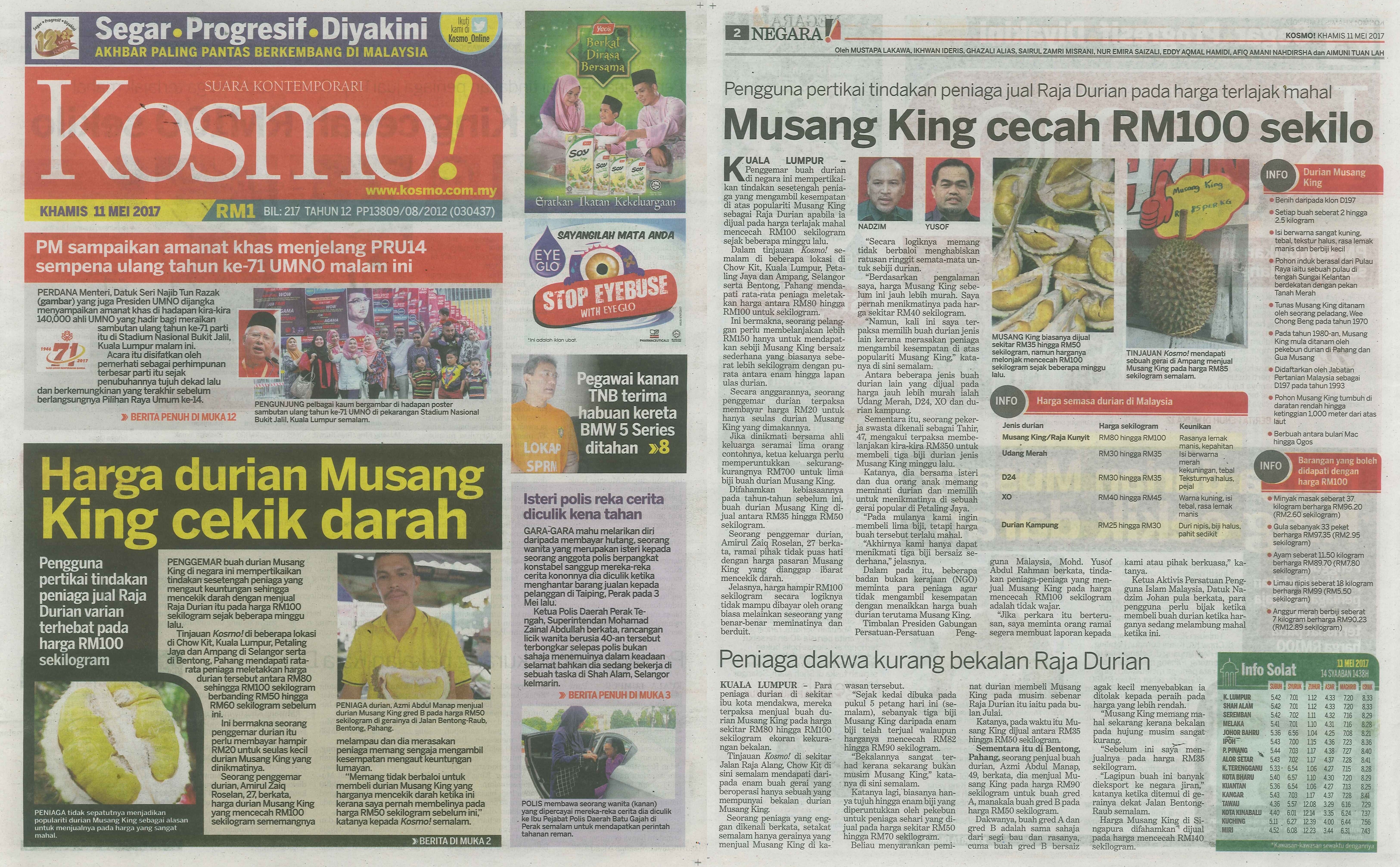 Sementara itu, seorang pekerja swasta dikenali sebagai Tahir,47, mengakui terpaksa membelanjakan kira-kira RM350 untuk membeli tiga biji durian jenis Musang King minggu lalu.