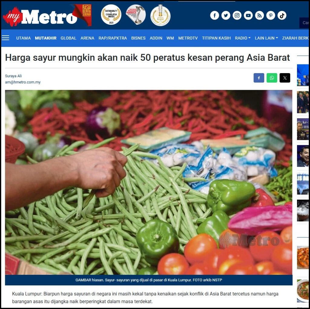 HARGA SAYUR MUNGKIN AKAN NAIK 50 PERATUS KESAN PERANG ASIA BARAT – HARIAN METRO – 23/03/2026