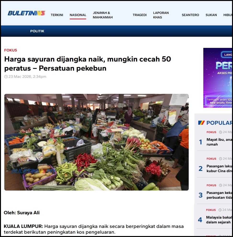 HARGA SAYURAN DIJANGKA NAIK, MUNGKIN CECAH 50 PERATUS – PERSATUAN PEKEBUN