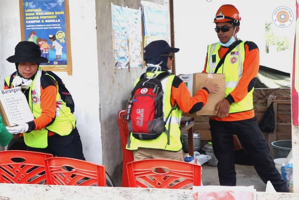 Sukarelawan Angkatan Pertahanan Awam (APM) dan Persatuan Pengguna Islam Malaysia (PPIM) yang turut mengikuti misi tersebut giat membantu mengagihkan bantuan berupa barangan keperluan harian serta makanan kepada mangsa.