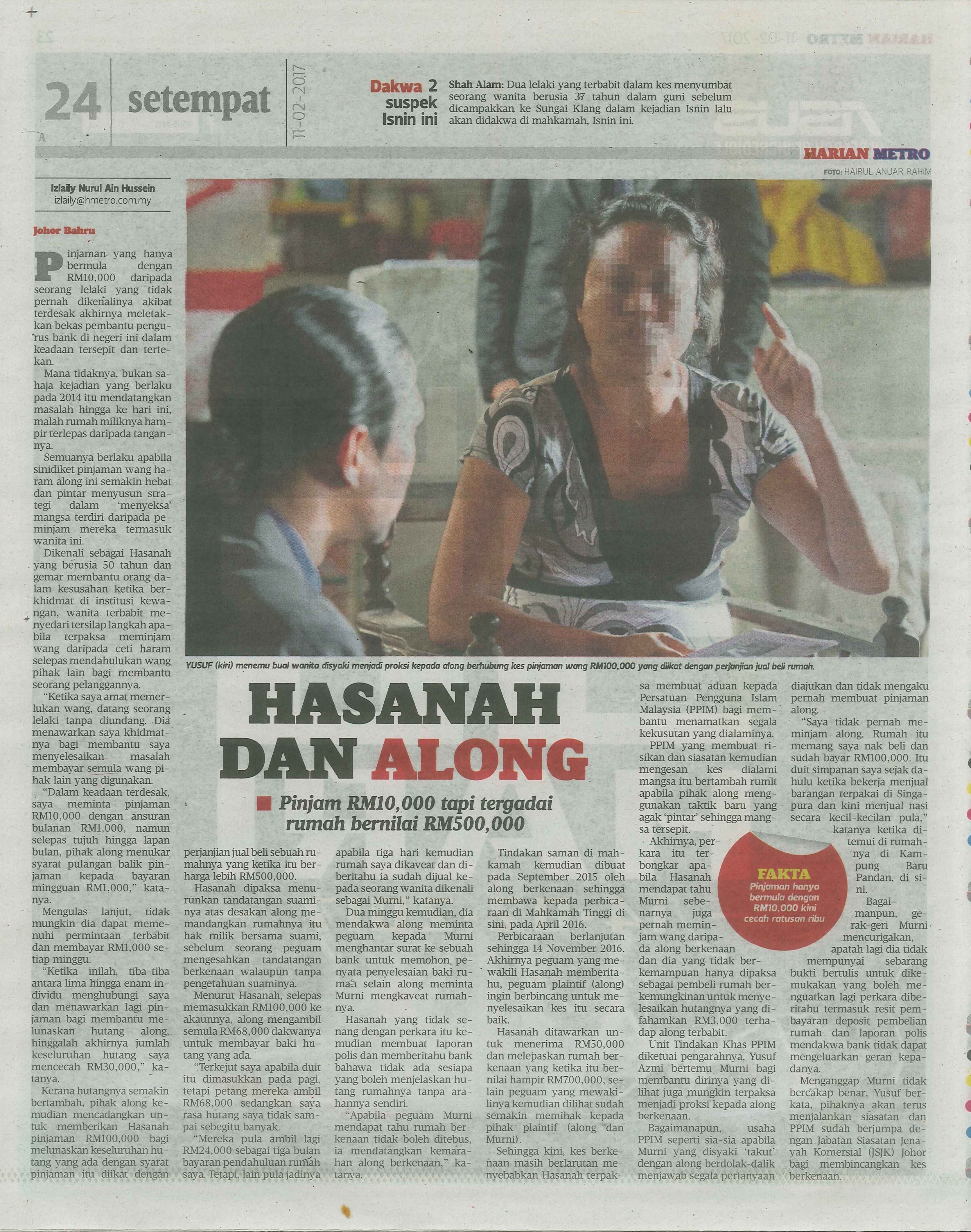 “Saya tidak pernah meminjam along. Rumah itu memang saya nak beli dan sudah bayar RM100,000. Itu duit simpanan saya sejak dahulu ketika bekerja menjual barangan terpakai di Singapura dan kini menjual nasi secara kecil-kecilan pula,” katanya ketika ditemui di rumahnya di Kampung Baru Pandan, di sini.