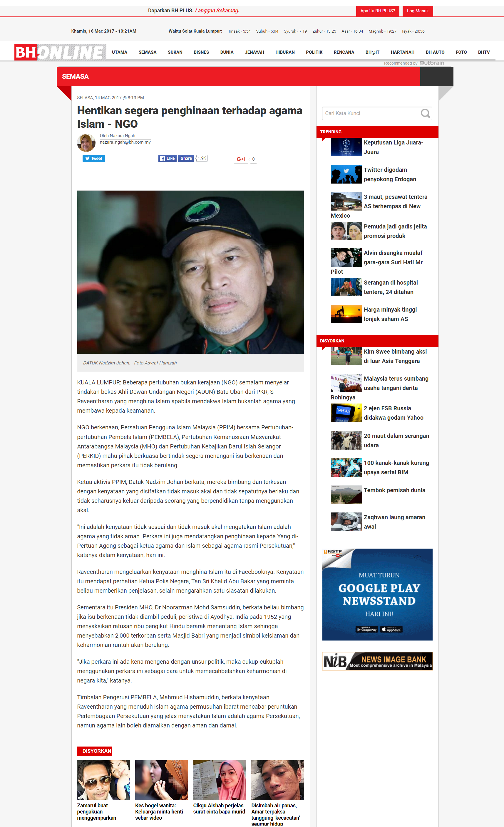 Timbalan Pengerusi PEMBELA, Mahmud Hishamuddin, berkata kenyataan Raveentharan yang menuduh Islam agama permusuhan ibarat mencabar peruntukan Perlembagaan Persekutuan yang jelas menyatakan Islam adalah agama Persekutuan, namun agama lain boleh diamalkan dengan aman dan damai.