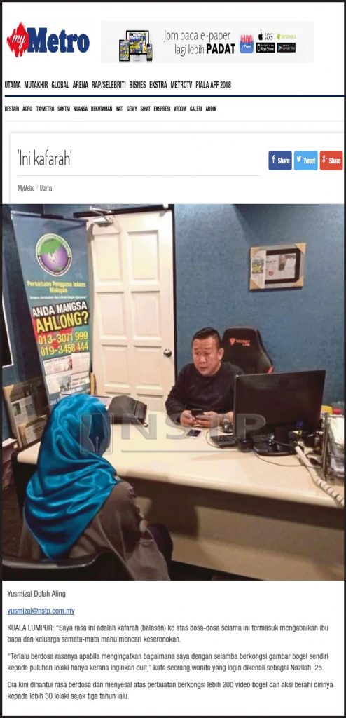 “Terlalu berdosa rasanya apabila mengingatkan bagaimana saya dengan selamba berkongsi gambar bogel sendiri kepada puluhan lelaki hanya kerana inginkan duit,” kata seorang wanita yang ingin dikenali sebagai Nazilah, 25.