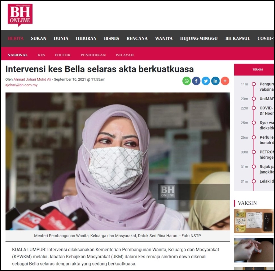 KUALA LUMPUR: Intervensi dilaksanakan Kementerian Pembangunan Wanita, Keluarga dan Masyarakat (KPWKM) melalui Jabatan Kebajikan Masyarakat (JKM) dalam kes remaja sindrom down dikenali sebagai Bella selaras dengan akta yang sedang berkuatkuasa.