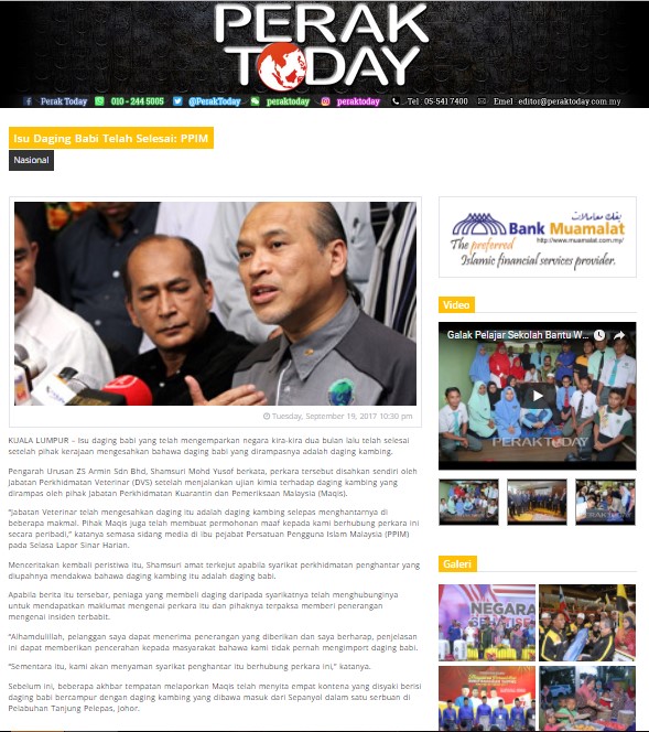“Jabatan Veterinar telah mengesahkan daging itu adalah daging kambing selepas menghantarnya di beberapa makmal. Pihak Maqis juga telah membuat permohonan maaf kepada kami berhubung perkara ini secara peribadi,” katanya semasa sidang media di ibu pejabat Persatuan Pengguna Islam Malaysia (PPIM) pada Selasa Lapor Sinar Harian.