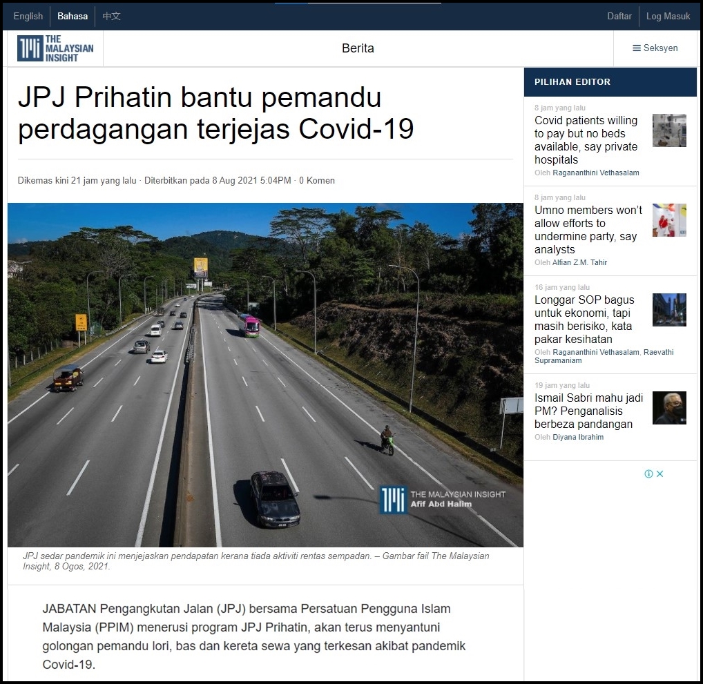 JABATAN Pengangkutan Jalan (JPJ) bersama Persatuan Pengguna Islam Malaysia (PPIM) menerusi program JPJ Prihatin, akan terus menyantuni golongan pemandu lori, bas dan kereta sewa yang terkesan akibat pandemik Covid-19.