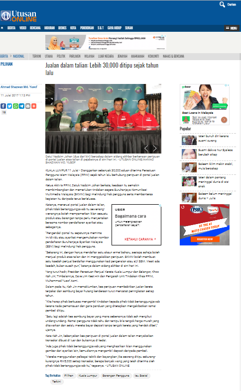 “Sekarang ini, dengan hanya mendaftar satu akaun e-mel baharu, sesiapa sahaja boleh menjual produk atas talian dan ini menggalakkan penipuan. SKMM boleh membuat satu kaedah penjual berdaftar menggunakan kad pengenalan atau sijil SSM. Mesti ada kaedah, bukan susah pun,” katanya dalam sidang akhbar di sini hari ini.