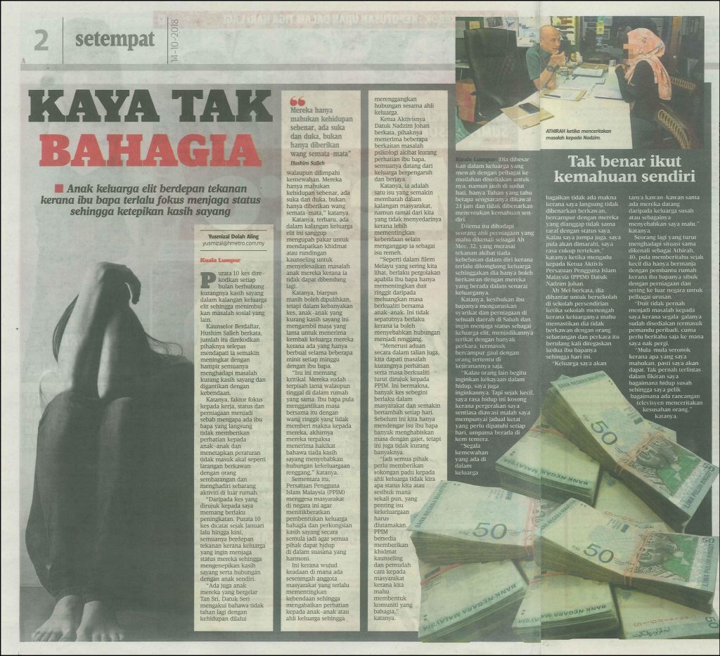 Ketua Aktivisnya Datuk Nadzim Johan berkata, pihaknya menerima beberapa berkaitan masalah psikologi akibat kurang perhatian ibu bapa, semuanya datang dari keluarga berpengaruh dan berjaya.
