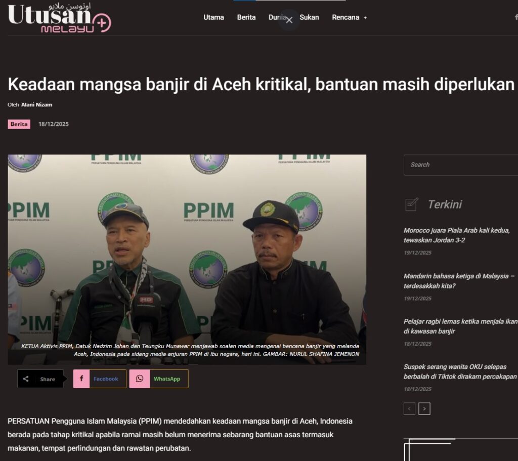 PERSATUAN Pengguna Islam Malaysia (PPIM) mendedahkan keadaan mangsa banjir di Aceh, Indonesia berada pada tahap kritikal apabila ramai masih belum menerima sebarang bantuan asas termasuk makanan, tempat perlindungan dan rawatan perubatan.