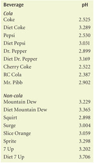 The chart to the left has the pH levels for some of the most popular sodas. Almost all commercial drinks, from colas to energy and sports drinks (including sugar-free ones) have acids added to them – such as phosphoric acid, citric acid, malic acid and tartaric acid.