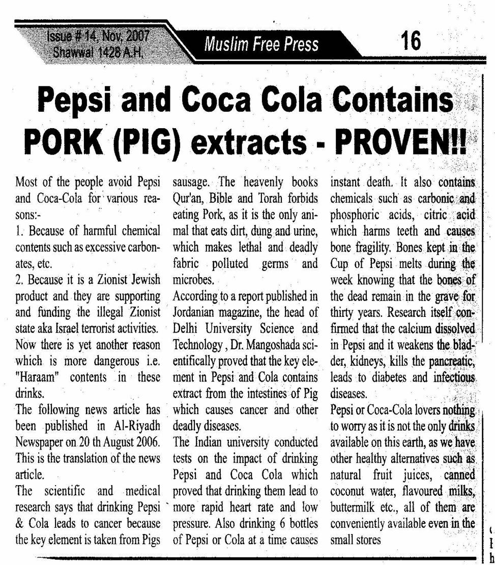 KONSUMER : Pepsi & Coca Cola mengandungi zat babi