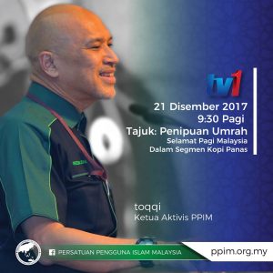 Ketua Aktivis PPIM, Toqqi, di Program Selamat Pagi Malaysia @ TV1 dalam Segmen Kopi Panas pada 21 Disember 2017 (Khamis) jam 9.30 pagi bagi membincangkan topik hangat Penipuan Umrah.
