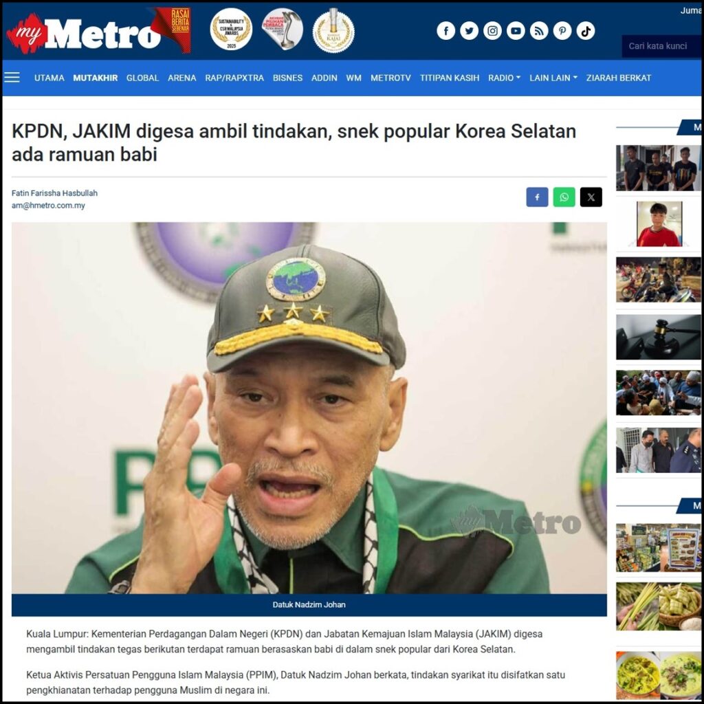 Terdahulu, satu video tular di platform TikTok berdurasi seminit tujuh saat menerusi video oleh pengguna liafa62 mendedahkan produk snek Korea Selatan menyembunyikan ramuan haram pada label terjemahan bahasa Inggeris pada bungkusan berkenaan.