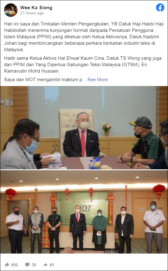 Hari ini saya dan Timbalan Menteri Pengangkutan, YB Datuk Haji Hasbi Haji Habibollah menerima kunjungan hormat daripada Persatuan Pengguna Islam Malaysia (PPIM) yang diketuai oleh Ketua Aktivisnya, Datuk Nadzim Johan bagi membincangkan beberapa perkara berkaitan industri teksi di Malaysia.