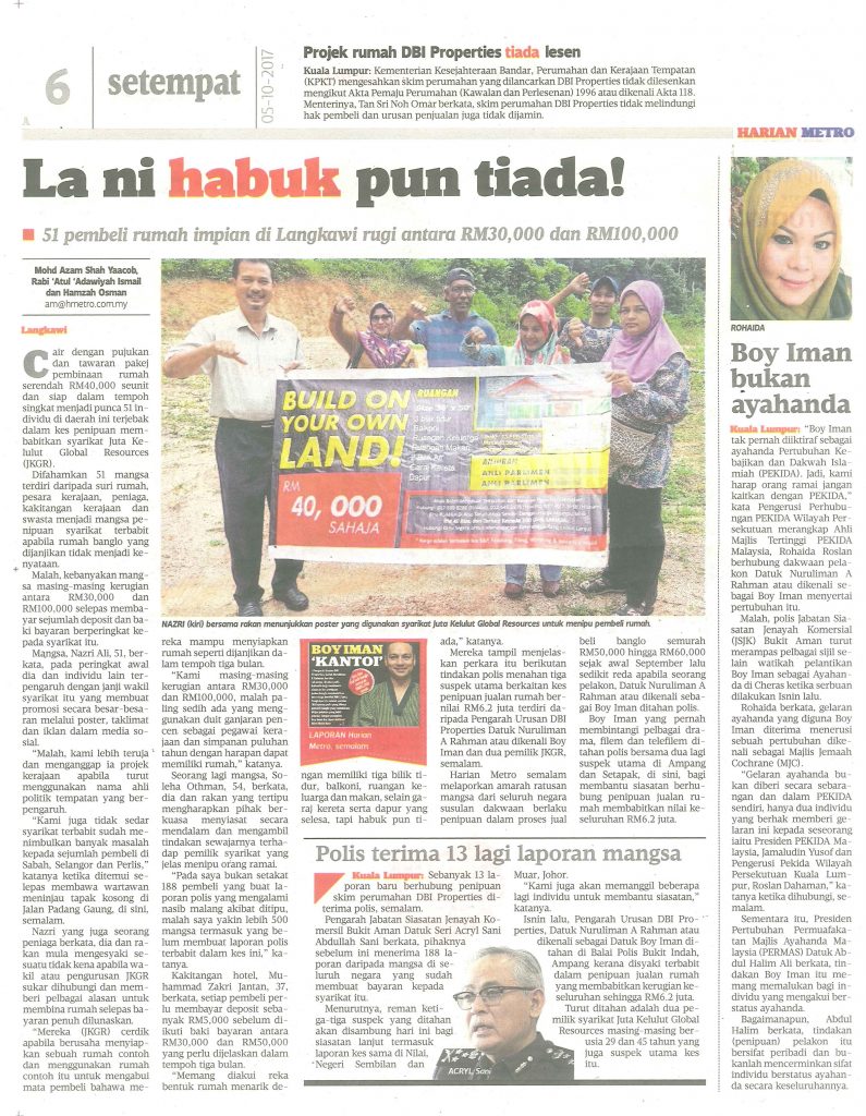 “Memang diakui reka bentuk rumah menarik dengan memiliki tiga bilik tidur, balkoni, ruangan keluarga dan makan, selain garaj kereta serta dapur yang Selesa, tapi habuk pun tiada,” katanya. Mereka tampil menjelaskan perkara itu berikutan tindakan polis menahan tiga suspek utama berkaitan kes penipuan jualan rumah bernilai RM6.2 juta terdiri daripada Pengarah Urusan DBI Properties Datuk Nuruliman A Rahman atau dikenali Boy Iman dan dua pemilik JKGR, semalam.