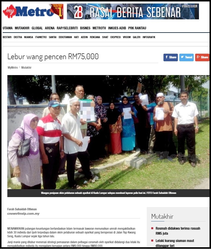 Mangsa, Mior Arbaaziz Safian Ramli, 63, berkata, dia terpengaruh dengan pelbagai tawaran syarikat itu selepas dimaklumkan mengenai imbuhan yang bakal diperolehi termasuk pakej menunaikan umrah dan berlandaskan niat untuk membantu perniagaan sesama orang Islam dia menghabiskan wang pencen sebagai penjawat awam RM75,000.