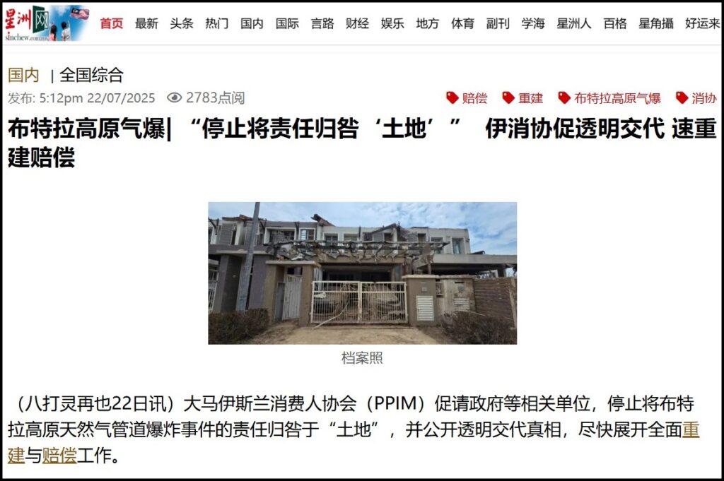 LETUPAN GAS PUTRA HEIGHTS | “BERHENTI MENYALAHKAN ‘TANAH’ ” PERSATUAN PENGGUNA ISLAM MEMINTA PENJELASAN YANG TELUS, PEMBINAAN SEMULA YANG CEPAT DAN PAMPASAN – SIN CHEW DAILY – 22/07/2025