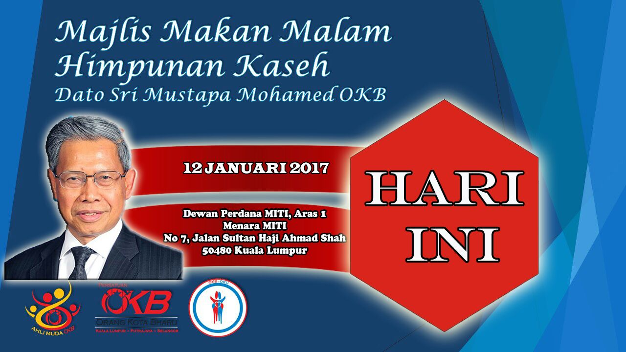 12 Jan 2017 – Telah berlangsungnya Majlis Makan Malam Himpunan Kasih bersama Persatuan Orang Kota Bharu (POKB) yang dirasmikan oleh Dato Sri Mustapa Mohamed Menteri Perdagangan Antarabangsa dan Industri semalam.