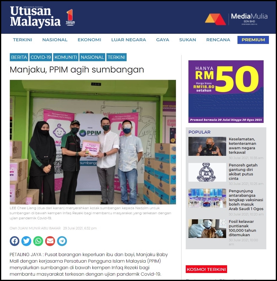 PETALING JAYA : Pusat barangan keperluan ibu dan bayi, Manjaku Baby Mall dengan kerjasama Persatuan Pengguna Islam Malaysia (PPIM) menyalurkan sumbangan di bawah kempen Infaq Rezeki bagi membantu masyarakat terkesan dengan ujian pandemik Covid-19.