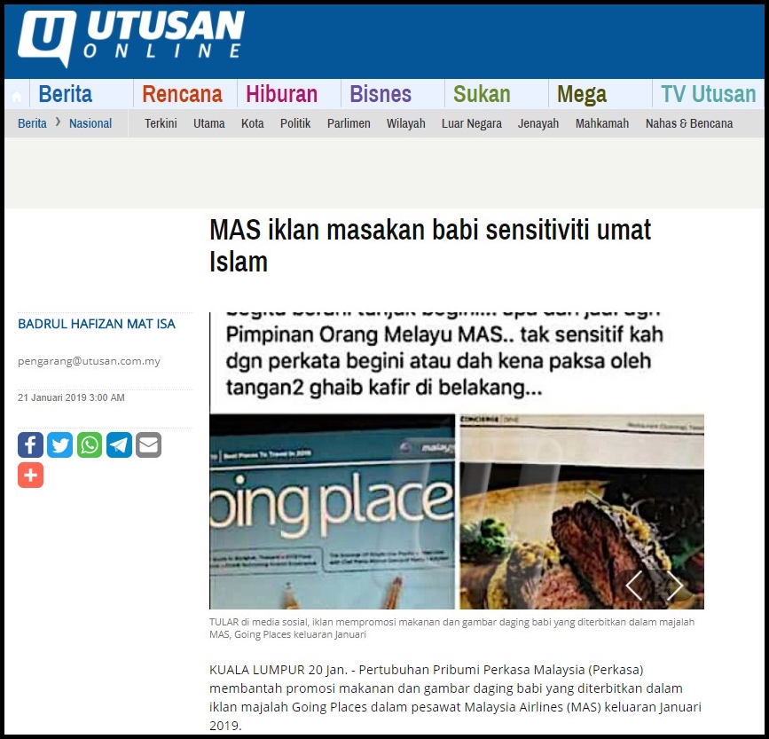 “Pihak MAS perlu prihatin dan peka dengan sensitiviti umat Islam, paparan gambar daging stik babi dalam iklan tersebut amatlah menggusarkan umat Islam. Apakah tiada lagi makanan lain yang boleh diiklankan,” katanya dalam kenyataan di sini hari ini.