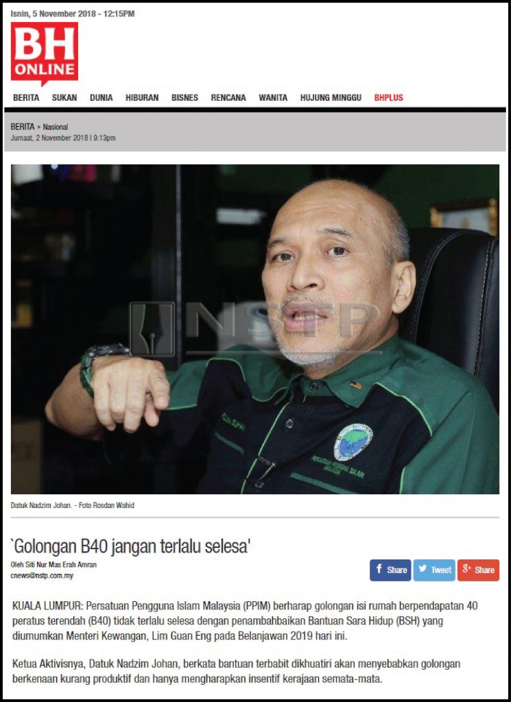 KUALA LUMPUR: Persatuan Pengguna Islam Malaysia (PPIM) berharap golongan isi rumah berpendapatan 40 peratus terendah (B40) tidak terlalu selesa dengan penambahbaikan Bantuan Sara Hidup (BSH) yang diumumkan Menteri Kewangan, Lim Guan Eng pada Belanjawan 2019 hari ini.