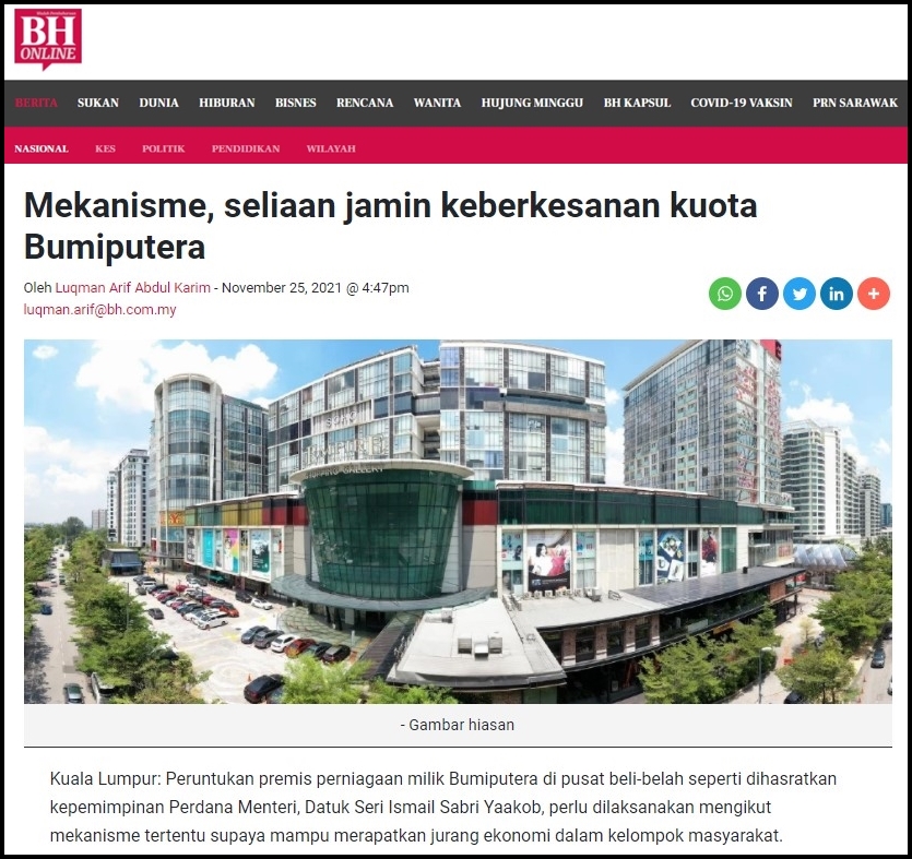 Perdana Menteri pada 18 November lalu, dilaporkan berkata kuota premis perniagaan milik Bumiputera di lokasi strategik perlu diwujudkan, selaras usaha meningkatkan daya saing dan mengukuhkan ekonomi golongan berkenaan.