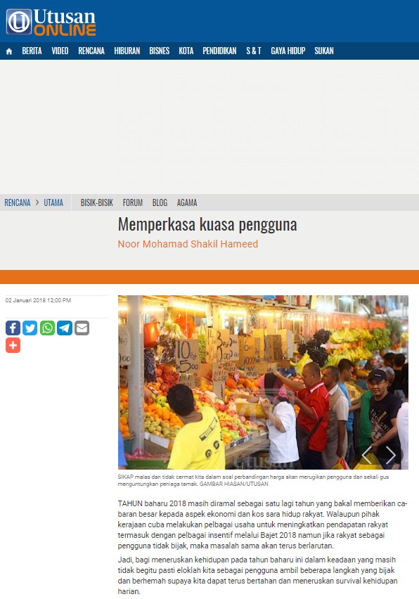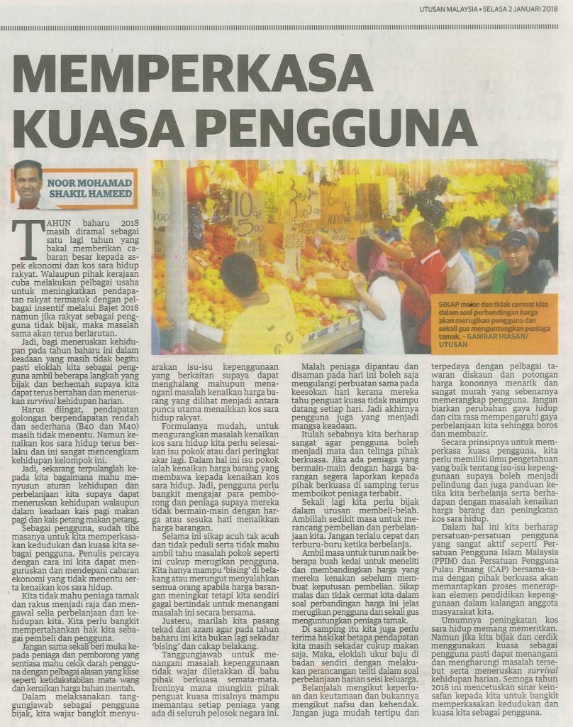 Umumnya peningkatan kos sara hidup memang memeritkan. Namun jika kita bijak dan cerdik menggunakan kuasa sebagai pengguna pasti dapat menangani dan mengharungi masalah tersebut serta meneruskan survival kehidupan harian. Semoga tahun 2018 ini mencetuskan sinar keinsafan kepada kita untuk bangkit memperkasakan kedudukan dan kuasa kita sebagai pengguna.