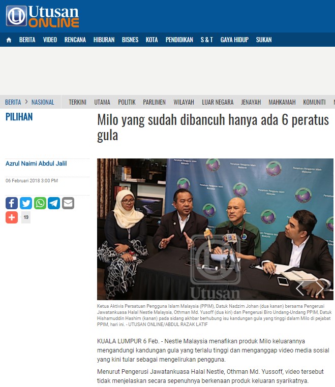 “Dan menurut arahan pembancuhan, lima sudu teh serbuk Milo yang dibancuhkan dalam air sebanyak 200 mililiter hanya mempunyai kandungan gula sebanyak enam peratus,” kata Othman dalam satu sidang akhbar, di sini hari ini.