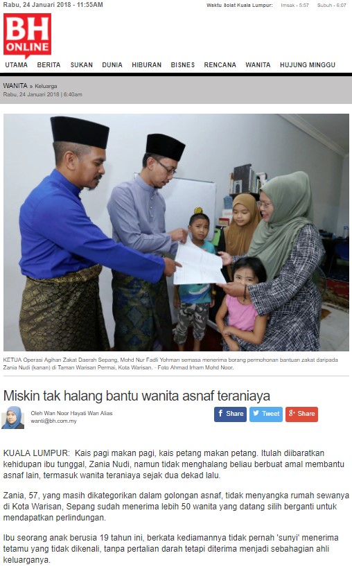 “Niat saya untuk membantu asnaf dan yakin ada hikmah tersendiri menyebabkan kehidupan saya sentiasa dipermudahkan walaupun kesempitan dari segi kewangan tetapi dilimpahi kesihatan yang baik.