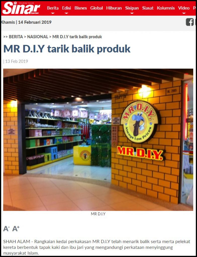 SHAH ALAM – Rangkaian kedai perkakasan MR D.I.Y telah menarik balik serta merta pelekat kereta berbentuk tapak kaki dan ibu jari yang mengandungi perkataan menyinggung masyarakat Islam.