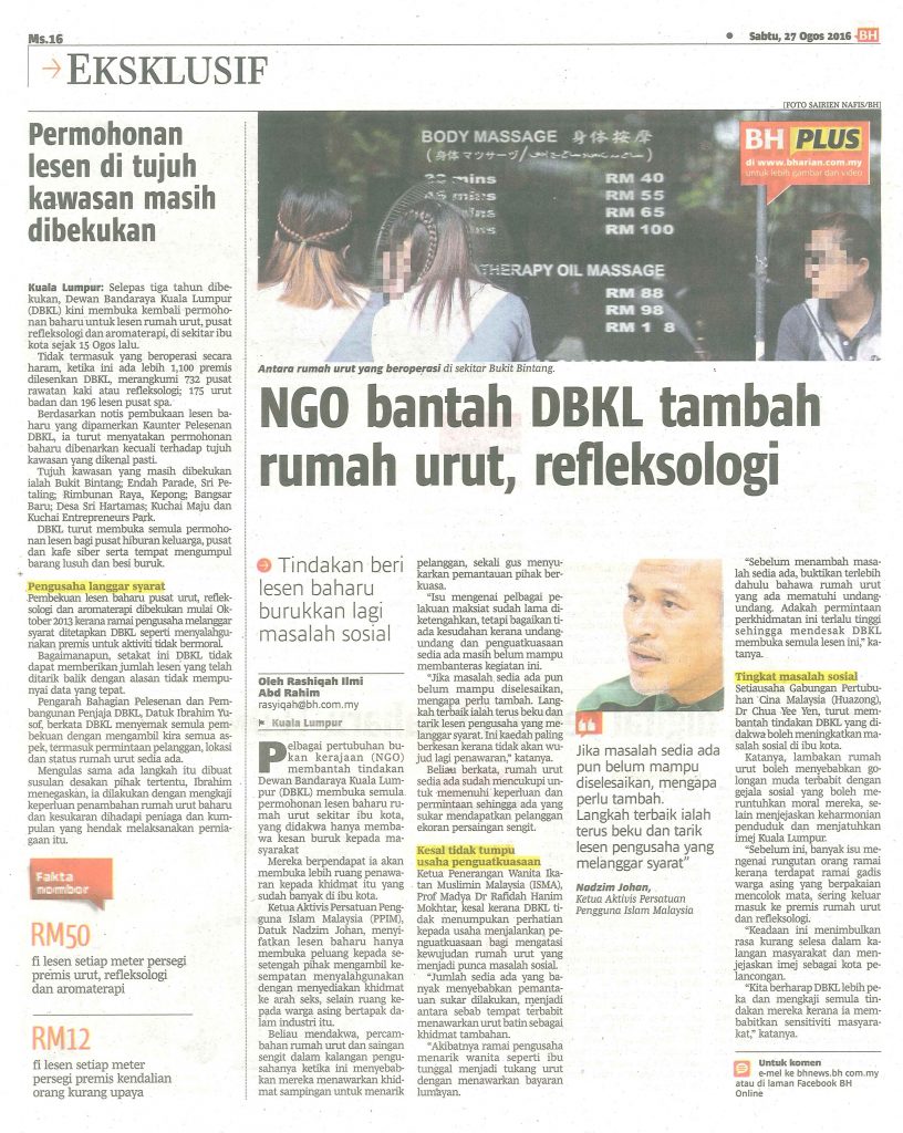 NGO BANTAH DBKL TAMBAH RUMAH URUT, REFLEKSOLOGI – BERITA HARIAN – 27/8/16