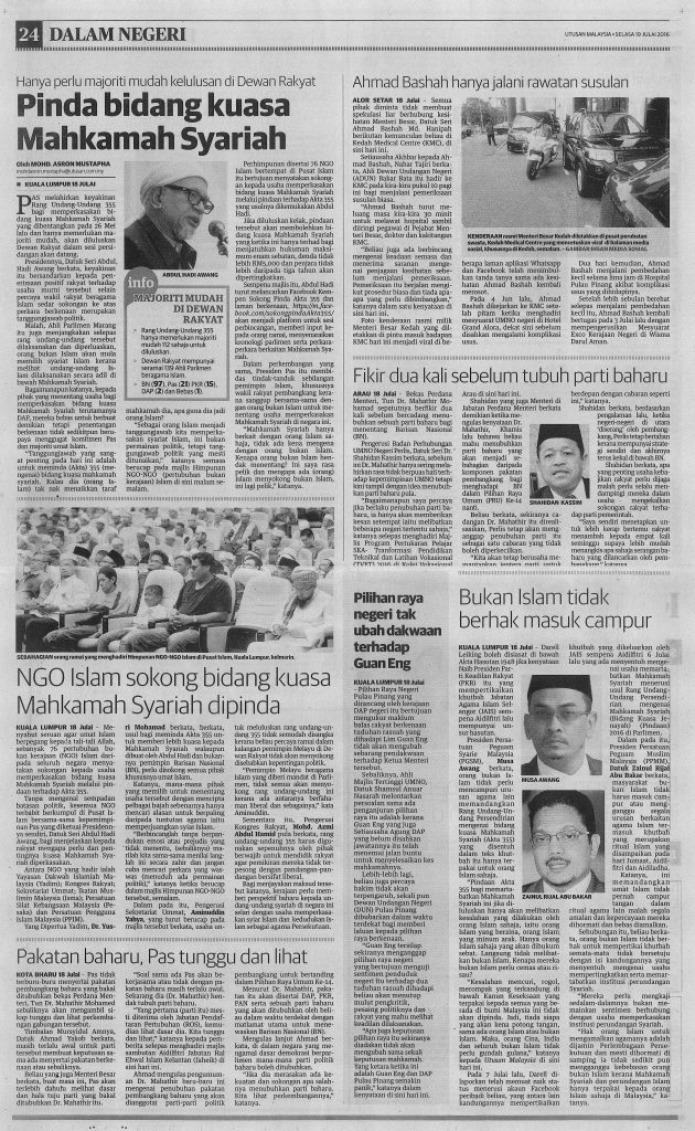 NGO ISLAM SOKONG BIDANG KUASA MAHKAMAH SYARIAH DIPINDA – UTUSAN MALAYSIA – 19/7/16