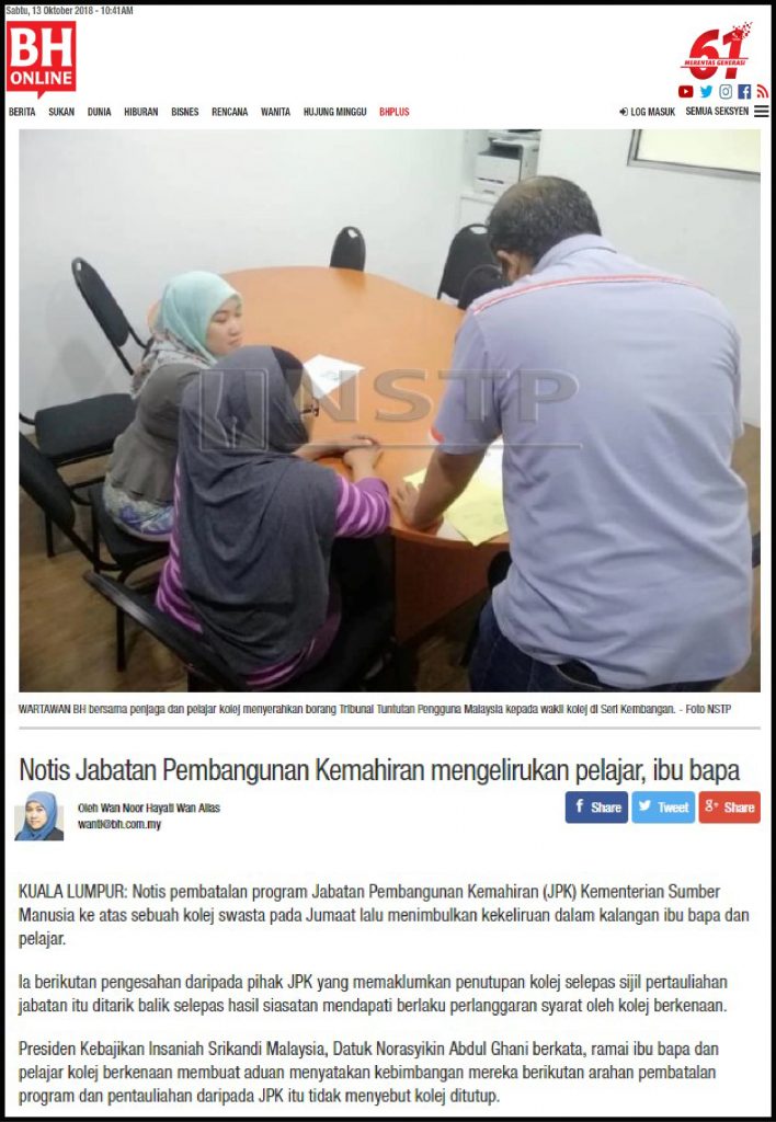 BH melaporkan pengesahan penutupan atas arahan oleh Ketua Pengarah JPK, Nidzam Kamarulzaman berhubung surat pembatalan pentauliahan kepada Pusat Bertauliah berkenaan.