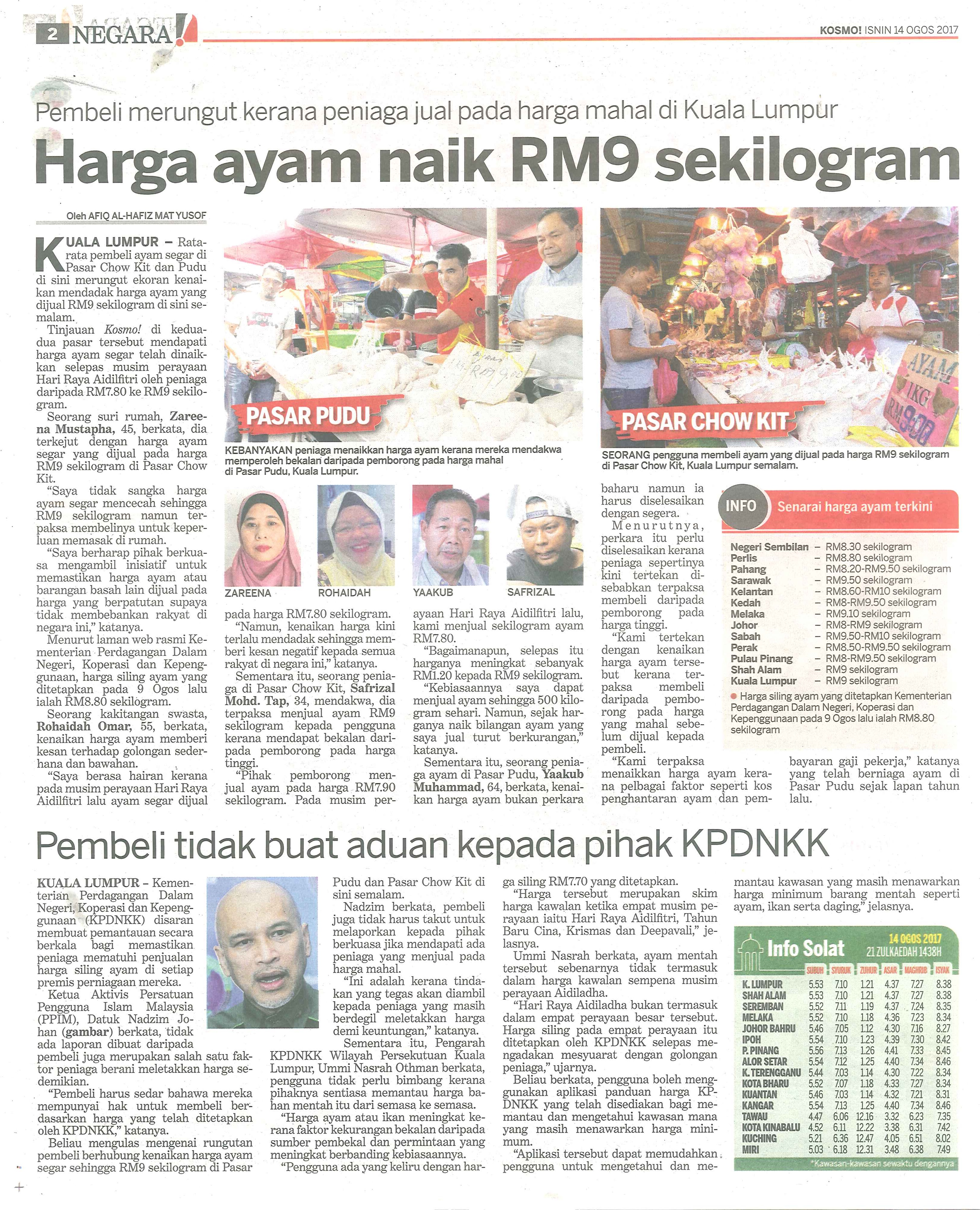 Beliau mengulas mengenai rungutan pembeli berhubung kenaikan harga ayam segar sehingga RM9 sekilogram di Pasar Pudu dan Pasar Chow Kit di sini semalam.
