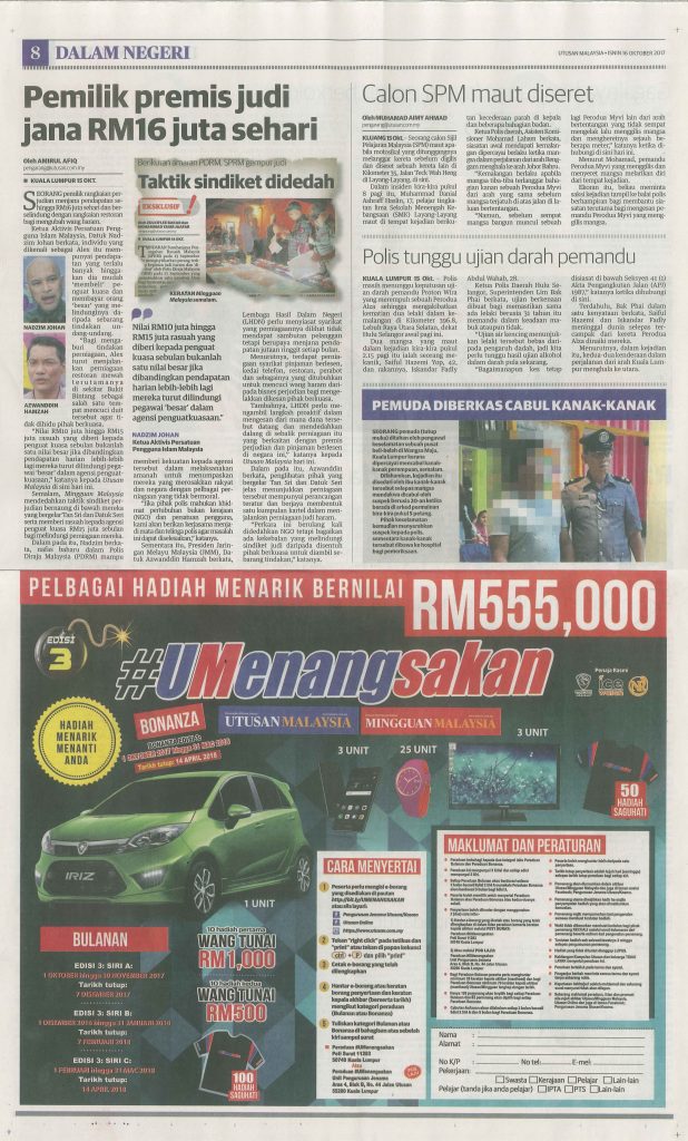 Semalam, Mingguan Malaysia mendedahkan taktik sindiket perjudian bernaung di bawah mereka yang bergelar Tan Sri dan Datuk Seri serta memberi rasuah kepada agensi penguat kuasa RM15 juta sebulan bagi melindungi perniagaan mereka. Dalam pada itu, Nadzim berkata, nafas baharu dalam Polis Diraja Malaysia (PDRM) mampu memberi kekuatan kepada agensi tersebut dalam melaksanakan amanah untuk menumpaskan mereka yang merosakkan rakyat dan negara dengan pelbagai perniagaan yang tidak bermoral.