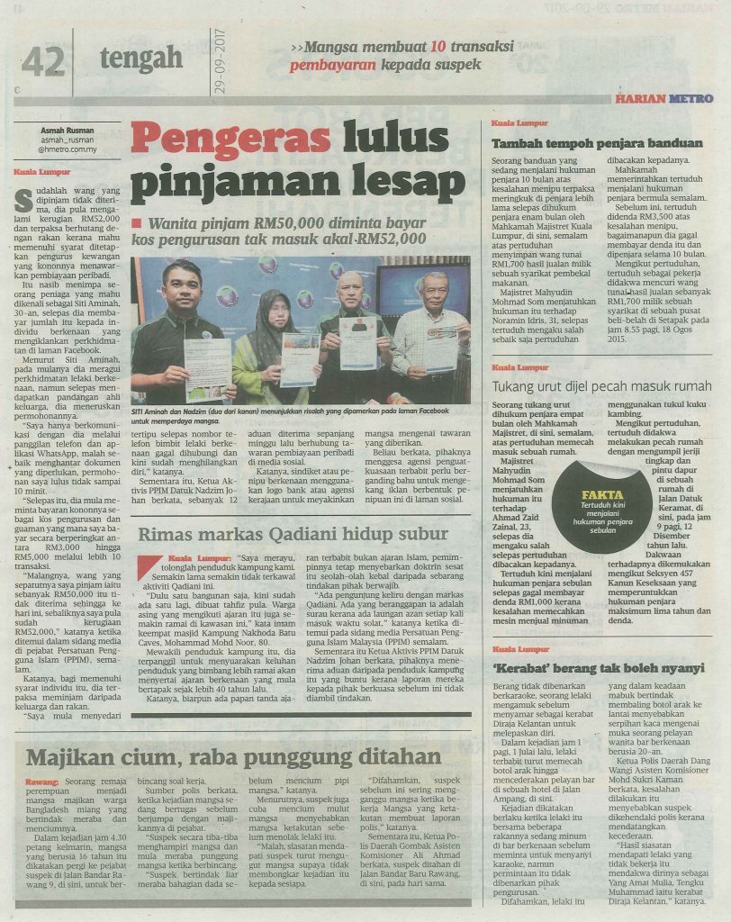 “Malangnya, wang yang sepatutnya saya pinjam iaitu sebanyak RM50,000 itu tidak diterima sehingga ke hari ini, sebaliknya saya pula sudah kerugiaan RM52,000,” katanya ketika ditemui dalam sidang media di pejabat Persatuan Pengguna Islam (PPIM), semalam.
