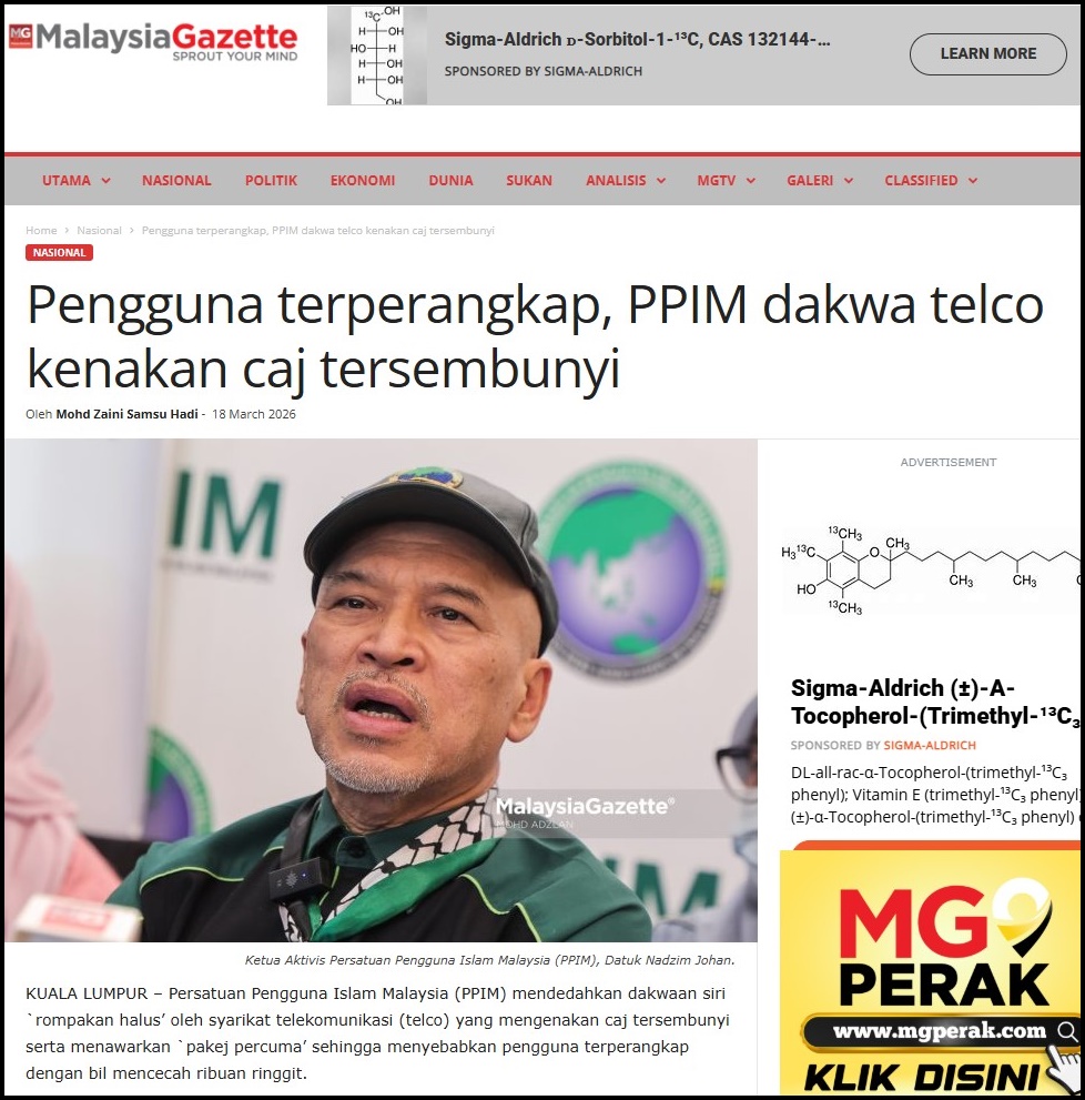 KUALA LUMPUR – Persatuan Pengguna Islam Malaysia (PPIM) mendedahkan dakwaan siri `rompakan halus’ oleh syarikat telekomunikasi (telco) yang mengenakan caj tersembunyi serta menawarkan `pakej percuma’ sehingga menyebabkan pengguna terperangkap dengan bil mencecah ribuan ringgit.