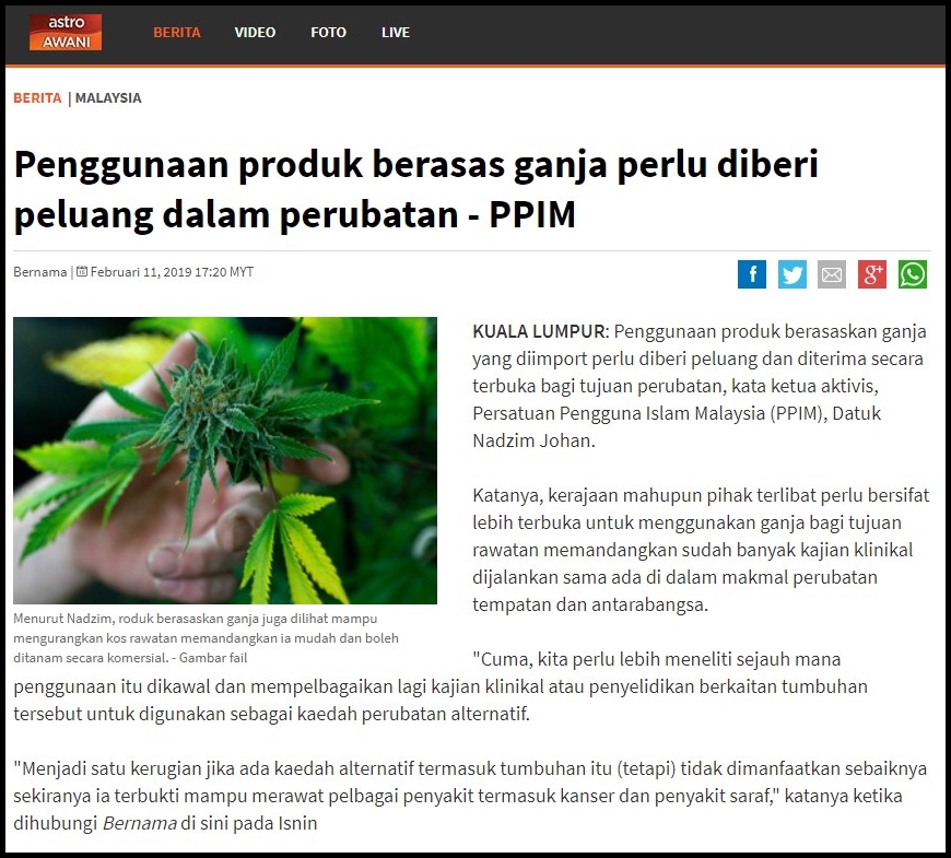 KUALA LUMPUR: Penggunaan produk berasaskan ganja yang diimport perlu diberi peluang dan diterima secara terbuka bagi tujuan perubatan, kata ketua aktivis, Persatuan Pengguna Islam Malaysia (PPIM), Datuk Nadzim Johan.