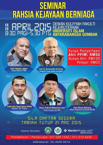 Seminar yang menampilkan dua tokoh usahawan iaitu Pengarah Urusan Media Karangkraf, Dato Dr. Husamuddin dan bekas Ketua Pegawai Eksekutif (CEO) Proton, Datuk Seri Syed Zainal Abidin turut disertai Ketua Aktivis PPIM, Dato Paduka Nadzim Johan, Tuan Mizam Mishar dan Ustaz Pahrol yang turut bertindak sebagai ahli panel.