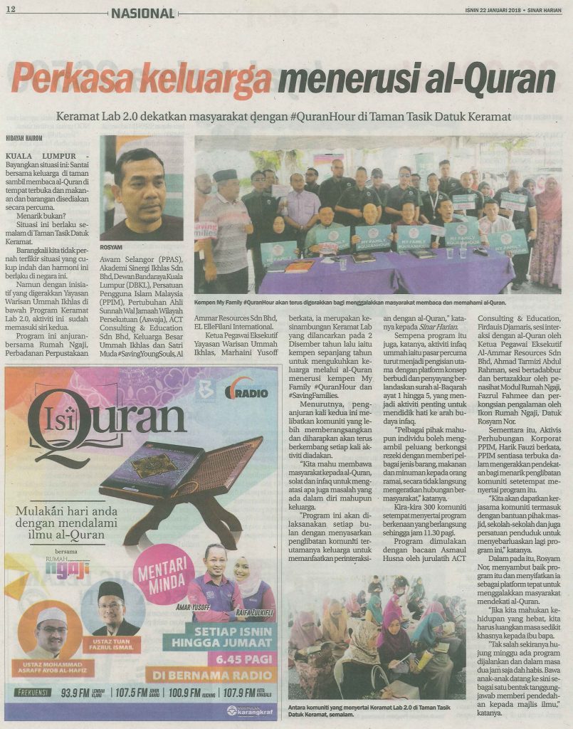 Ketua Pegawai Eksekutif Yayasan Warisan Ummah Ikhlas, Marhaini Yusof berkata, ia merupakan kesinambungan KeramatLab yang dilancarkan pada 2 Disember tahun lalu iaitu kempen sepanjang tahun untuk mengukuhkan keluarga melalui al-Quran menerusi kempen My Family #Quran Hour dan #SavingFamilies.