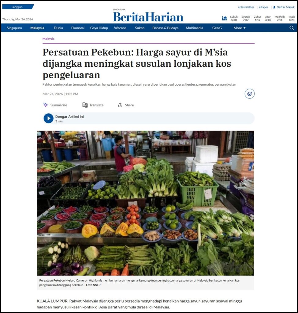 PERSATUAN PEKEBUN: HARGA SAYUR DI M’SIA DIJANGKA MENINGKAT SUSULAN LONJAKAN KOS PENGELUARAN – BERITA HARIAN SINGAPURA – 24/03/2026