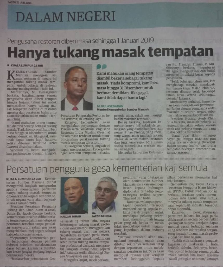 Sementara itu, Ketua Aktivis Persatuan Pengguna Islam Malaysia (PPIM), Datuk Nadzim Johan berkata, kerajaan perlu mewujudkan satu agensi khas untuk menyelia tukang masak tempatan agar keperluan industri tersebut dapat dipenuhi.