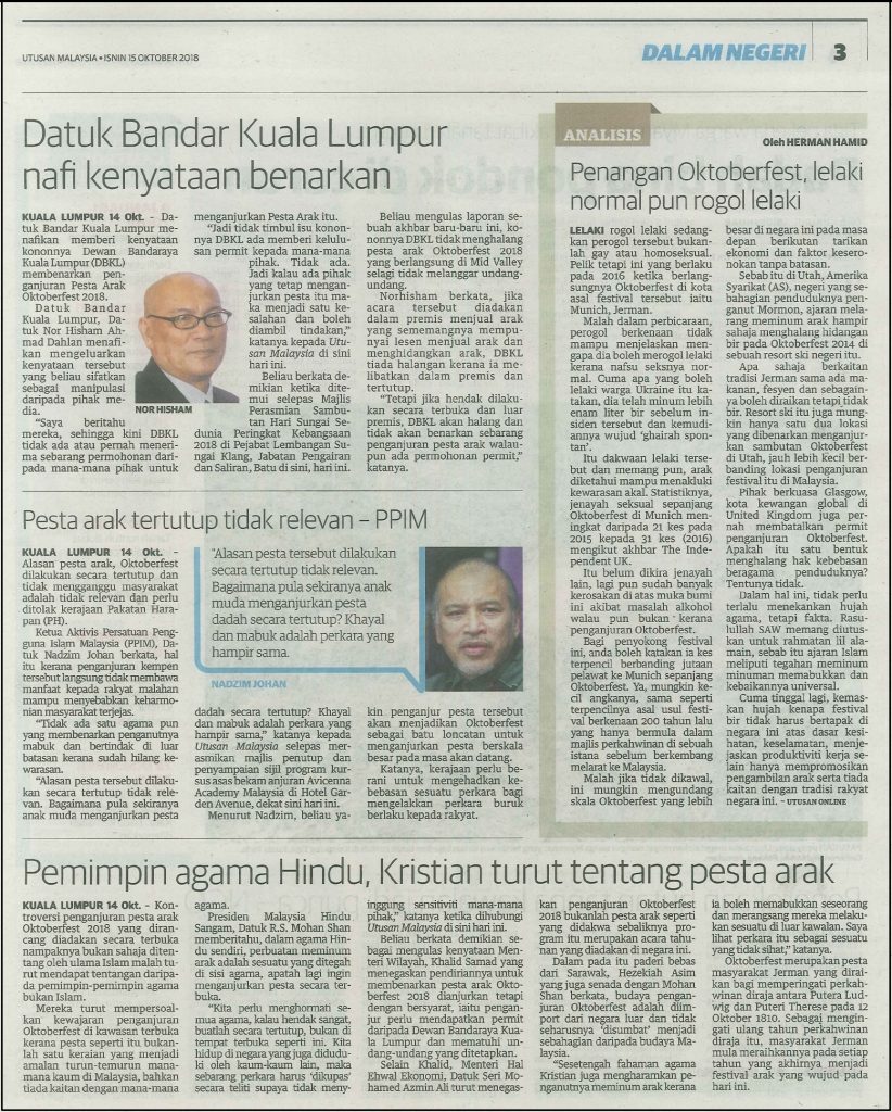 KUALA LUMPUR 14 Okt. – Alasan pesta arak, Oktoberfest dilakukan secara tertutup dan tidak mengganggu masyarakat adalah tidak relevan dan perlu ditolak kerajaan Pakatan Harapan (PH).