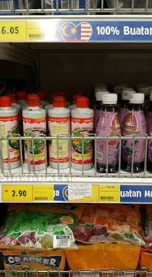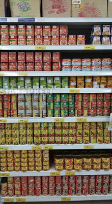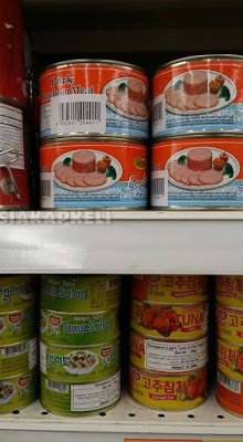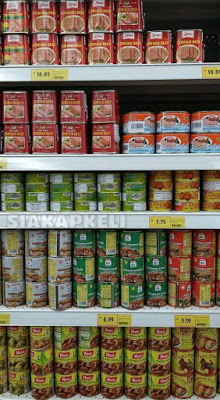 Berdasarkan gambar bahagian atas rak diletakan makanan tidak halal iaitu daging khinzir dalam tin dan bawahnya pula adalah rendang ayam dalam tin.
