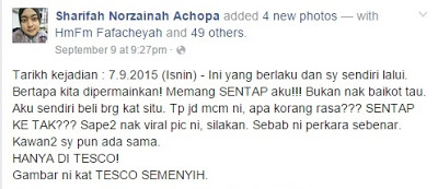 Menjadi viral di laman Facebook sejak 9 September lalu beberapa keping gambar yang dimuatnaik oleh seorang wanita bernama Sharifah Norzainah Achopa di mana beliau melahirkan rasa terkejut dan kecewa dengan sebuah pusat membeli belah terkenal.