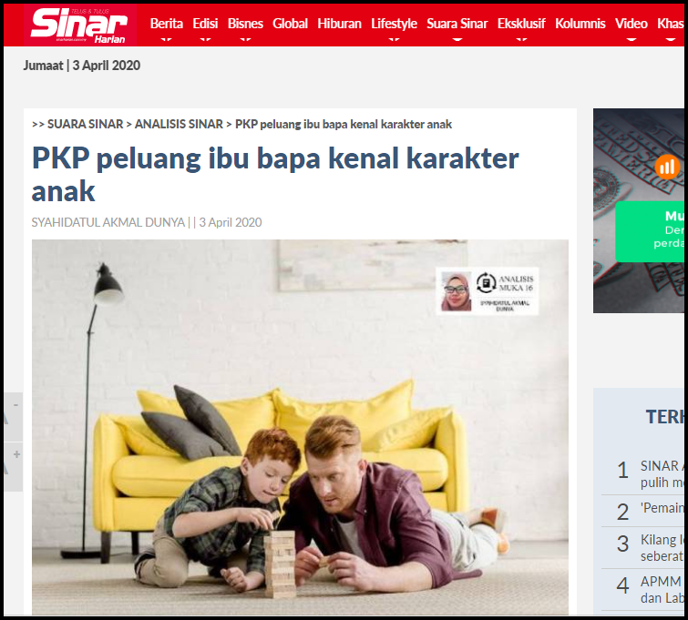 Benar sekali, bagi penulis jadikan tempoh PKP yang sedang berlangsung sebagai medium untuk lebih mengenali ‘wajah’ sebenar si anak. Ibu bapa yag bekerjaya seharusnya perlu menghargai tempoh ini. Mana tidaknya, sebelum ini usai Subuh sudah menghantar anak ke sekolah, pusat asuhan atau rumah pengasuh dan menjelang malam barulah berpeluang bersua dengan anak-anak. Bukankah begitu berharganya momen PKP kepada ibu bapa dan anak. Jadi manfaatkanlah ia dengan sebaiknya.